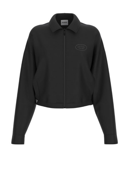 Deze zwarte crop jacket van Guess heeft een verkort model met klassieke kraag en ritssluiting over de volledige lengte. Op de borst zie je een geborduurd ovaal logo met 'Guess Jeans' tekst in tone-on-tone uitvoering. Het jasje heeft steekzakken aan de voorkant en lange mouwen met ribboord aan de zoom. De rechte pasvorm eindigt net op de taille en geeft je silhouet een strakke, sportieve finish. Het zwarte sweatstofachtige materiaal voelt stevig aan en houdt zijn vorm goed.