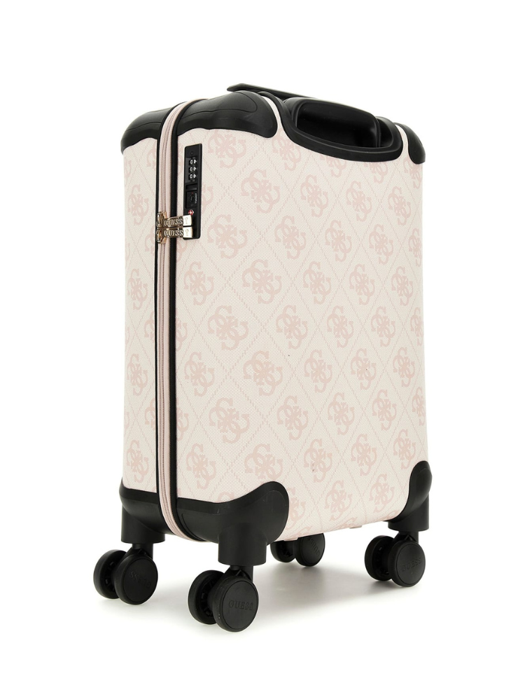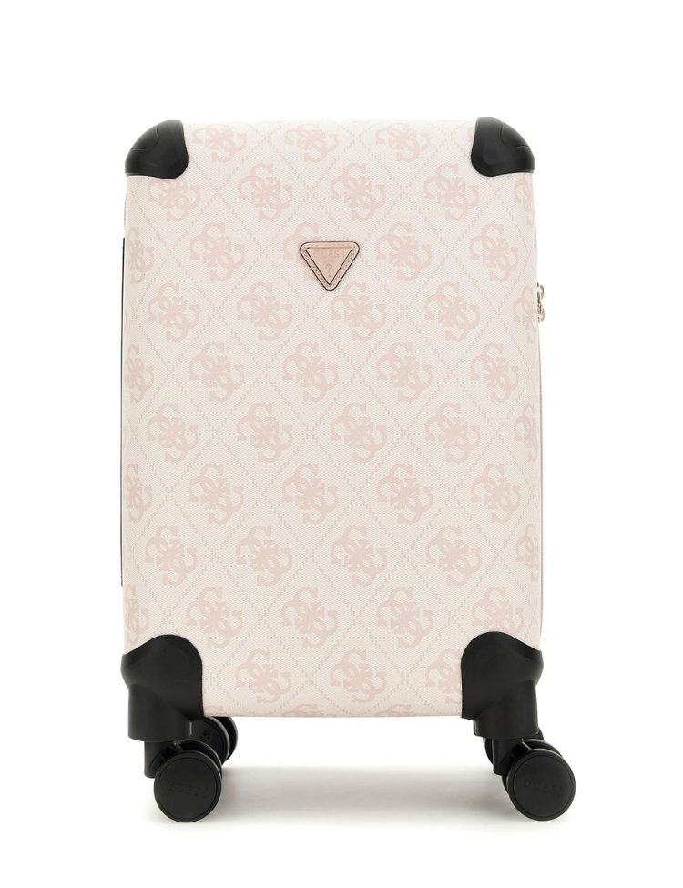 De Berta Trolley van Guess is dé perfecte mix van elegantie en functionaliteit. Deze compacte 4-wieler is uitgevoerd in een zachte poederroze kleur met een all-over 4G-logo print, afgewerkt met roségouden details en het iconische Guess-logo op de voorzijde. Een echte eyecatcher op elk vliegveld!