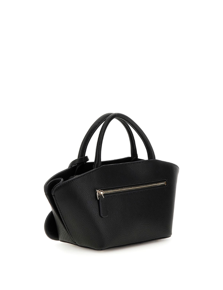 De Guess Bolena Mini Satchel - zwart is een elegante handtas die moeiteloos stijl en functionaliteit combineert. Gemaakt van hoogwaardig imitatieleer met een subtiele structuur en goudkleurige accenten. De tas heeft een gestructureerd design met stevige handvatten en een afneembare schouderband, zodat je hem op verschillende manieren kunt dragen. Binnenin vind je meerdere vakken voor optimale organisatie, terwijl de ritssluiting je spullen veilig opbergt. De hartvormige hanger met sleuteldetail geeft de tas een charmante, vrouwelijke touch. Perfect voor dagelijks gebruik of een stijlvolle avondlook.