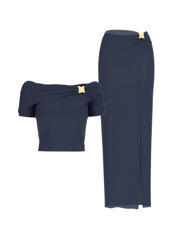 Deze combi-set bestaat uit een off-shoulder top met korte mouwen en een bijpassende rok met split. De top heeft een gedrapeerd detail over de schouders met aan beide zijden goudkleurige hardware. De rok heeft een hoge taille met eenzelfde gedrapeerd accent en goudkleurig detail. De split loopt aan de voorkant en zorgt voor bewegingsvrijheid. De blackened blue kleur geeft het ensemble een rijke uitstraling. Het stretchy materiaal zorgt voor een comfortabele pasvorm.