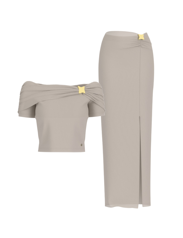 Deze tweedelige set in zandkleurig bestaat uit een off-shoulder top en een lange rok. De top heeft korte mouwen met gedrapeerd detail en een goudkleurig sieraccent op de voorzijde. De rok valt strak met een split aan de zijkant en heeft een elastische tailleband, afgewerkt met hetzelfde goudkleurige detail. Beide items zijn gemaakt van soepele stretchstof en hebben een subtiel G-logootje. De off-shoulder hals geeft de top een vrouwelijke uitstraling.