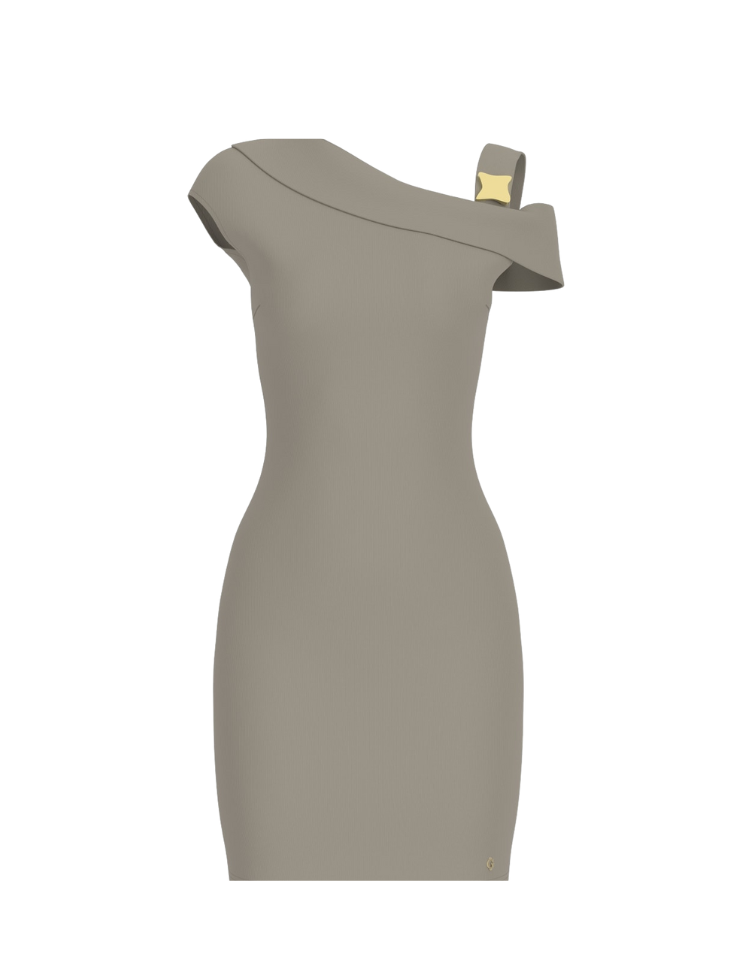 Deze korte jurk van Guess in de kleur sage leaf heeft een asymmetrische halslijn met een brede band die over één schouder valt. De jurk heeft een strakke, getailleerde pasvorm en valt tot kort boven de knie. De effen stof heeft een gladde structuur. Aan de schouderband zit een goudkleurig hardwaredetail. Het model sluit nauw aan op het lichaam en heeft korte mouwen.