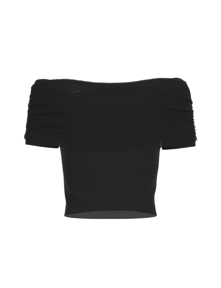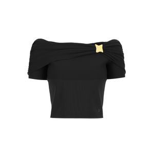 Deze off shoulder top in zwart heeft een brede halslijn die over de schouders valt. De korte mouwen zijn geplisseerd en geven structuur aan het silhouet. Een gekruist detail op de voorzijde met een goudkleurig accent zorgt voor een opvallende finish. De top heeft een cropped lengte en is gemaakt van een soepele tricot stof met stretch. De boorden zijn geribd afgewerkt. Het zwarte basismodel combineert je makkelijk met een high waist jeans of rok.