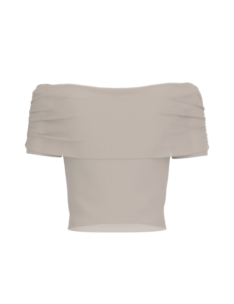 Deze off shoulder top in beige heeft een gedrapeerde halslijn die de schouders benadrukt. De korte mouwen zijn subtiel gerimpeld en aan de voorzijde zie je een opvallend goudkleurig detail ter hoogte van het decolleté. Het topje is gemaakt van ribstof die soepel aansluit en gemaakt is van stretchmateriaal. De cropped lengte eindigt net boven de taille. Aan de onderzijde vind je het Guess logo.
