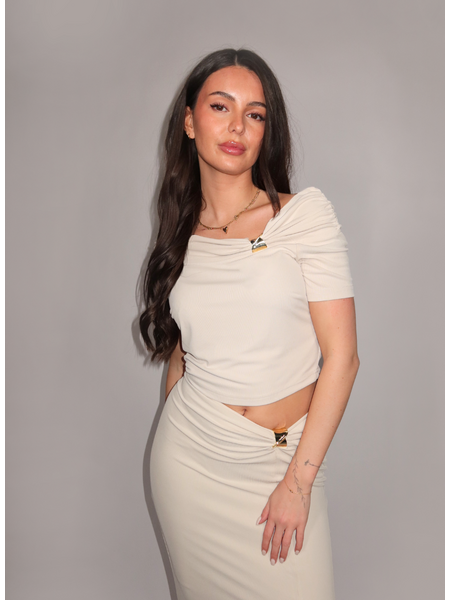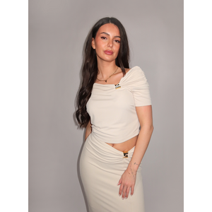 Design: Off shoulder met gedrapeerde halslijn en goudkleurig detail