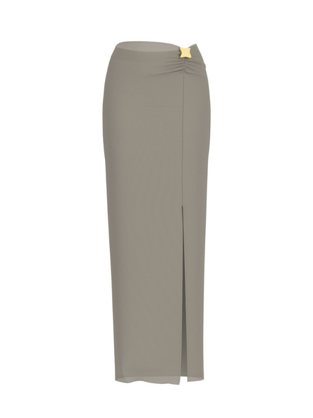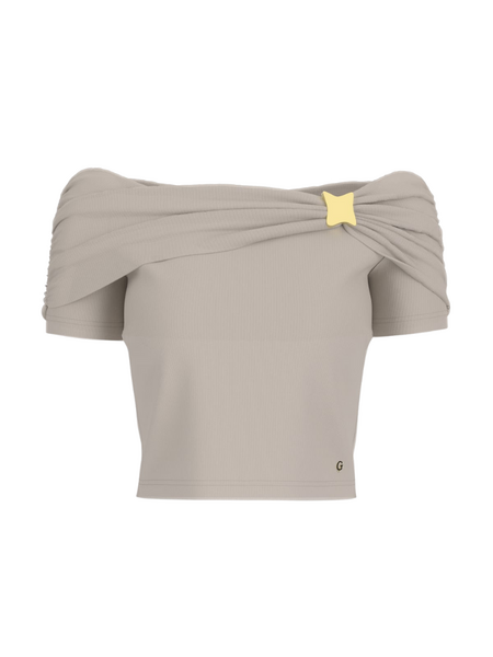 Dit off shoulder top in regal brown is uitgevoerd in een ribgebreide kwaliteit met een aangesloten pasvorm. De schouders zijn gedrapeerd en voorzien van een goudkleurig vierkant detail centraal op de borstlijn. De korte mouwtjes zijn licht geplooid. Het model heeft een cropped lengte die net boven de taille valt. De zachte stretchstof zorgt voor een comfortabele pasvorm die goed aansluit. De G-logoborduring staat subtiel aan de onderzijde.