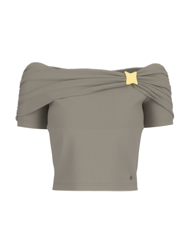 Deze off shoulder top van Guess is uitgevoerd in een zachte sage leaf kleur. Het ribgebreide model heeft een gedrapeerd detail over de schouders met een goudkleurige vierkante hanger als accent. De korte mouwtjes hebben een gerimpeld effect. De stof heeft een stretchkwaliteit en de top heeft een korte lengte die net op de taille valt. Een subtiel logo borduurseltje zit aan de onderzijde.