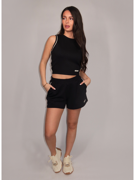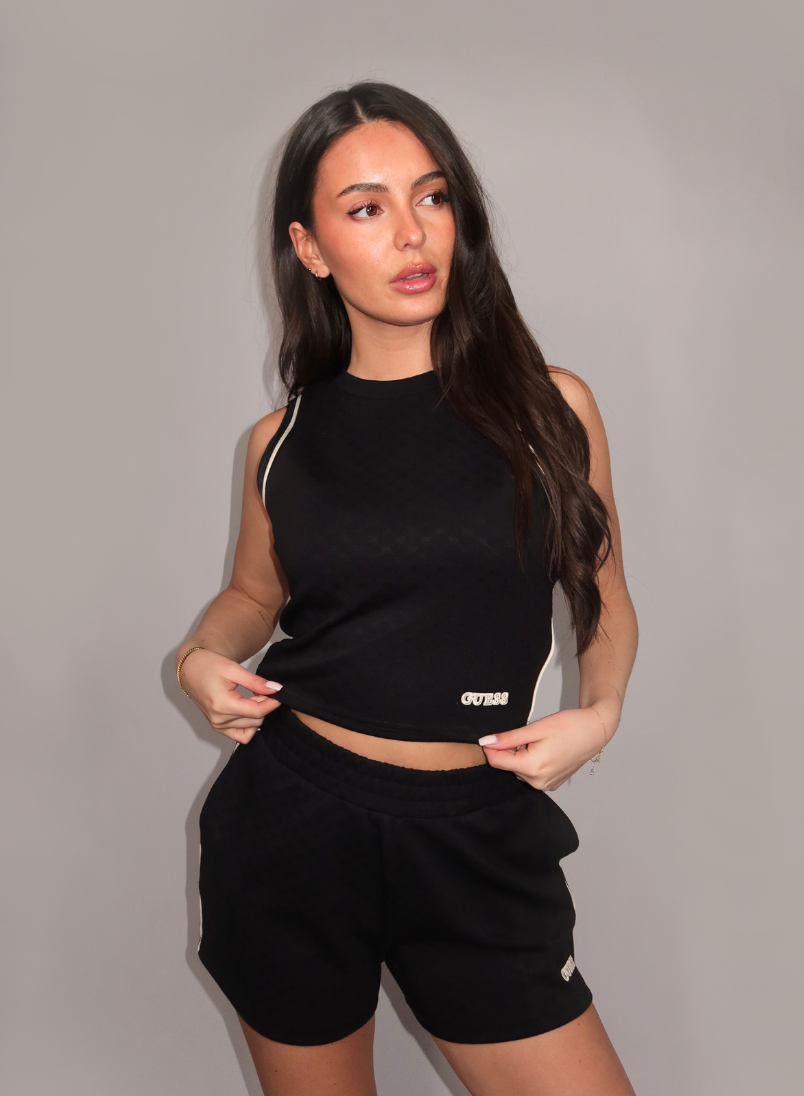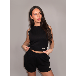 Draag dit zwarte topje met de bijpassende broek voor een complete sportieve look. De cropped lengte combineert perfect met hoogsluitende jeans of een pantalon. Het mouwloze design maakt het item geschikt voor laagjes look. Guess brengt sportieve details samen in een veelzijdige basis voor je garderobe.