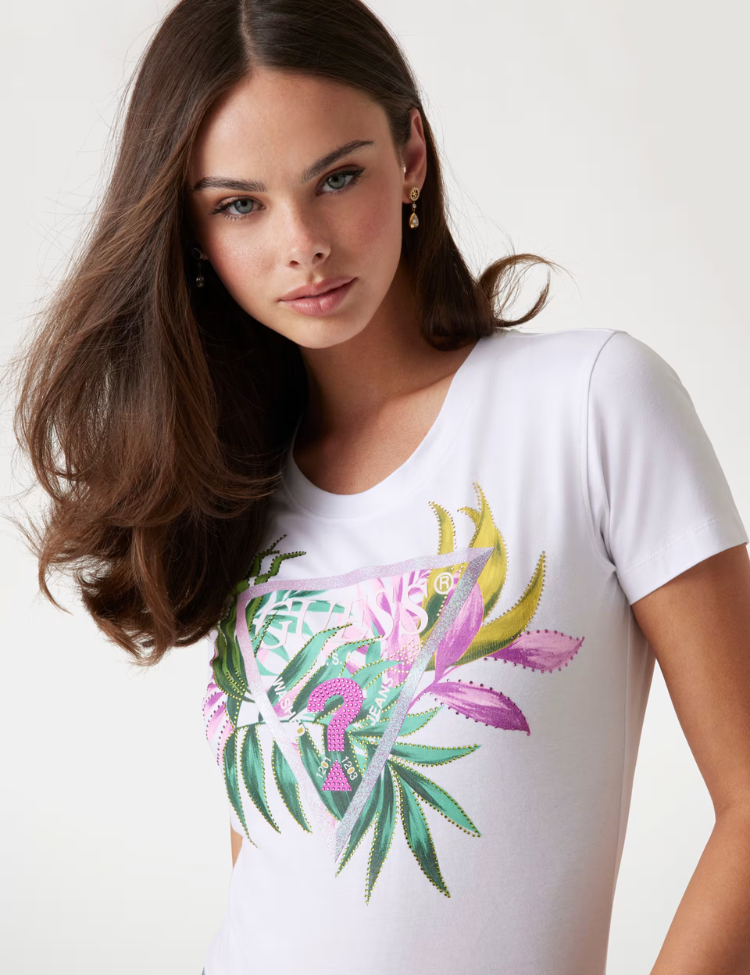 Het Guess CN SS Leaf Triangle T-Shirt is een frisse update van het iconische GUESS T-shirt. Het klassieke silhouet krijgt een glamoureuze touch dankzij het glinsterende straslogo op de borst. Perfect voor een everyday look met nét dat beetje extra flair.