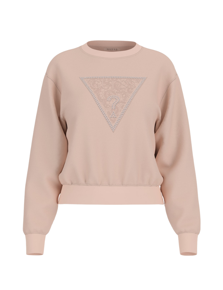 Deze sweater in een zachte vanilletint heeft een ronde hals en lange mouwen met ribgebreide boorden. Op de voorzijde zit een driehoekig logo met het woord GUESS, versierd met kant en omlijst met een rij steentjes. Het sweatshirt heeft een casual pasvorm met een elastische tailleband die voor een lichte cropped lengte zorgt. De stof voelt comfortabel aan en houdt goed zijn vorm.