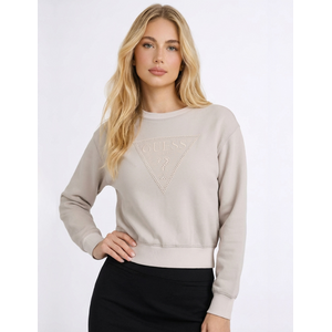 Deze crèmewitte trui in sweater stijl heeft lange mouwen en een ronde halsboord. Op de voorkant vind je een driehoekig logo met het woord GUESS en een vraagteken, uitgevoerd in kleine steentjes die een kanten effect creëren. De boorden aan de mouwen en onderzijde zijn afgewerkt met ribstof. Het sweatshirt heeft een licht korte pasvorm die net op de taille valt. De zachte stof geeft comfort en de strakke afwerking zorgt voor een nette uitstraling.