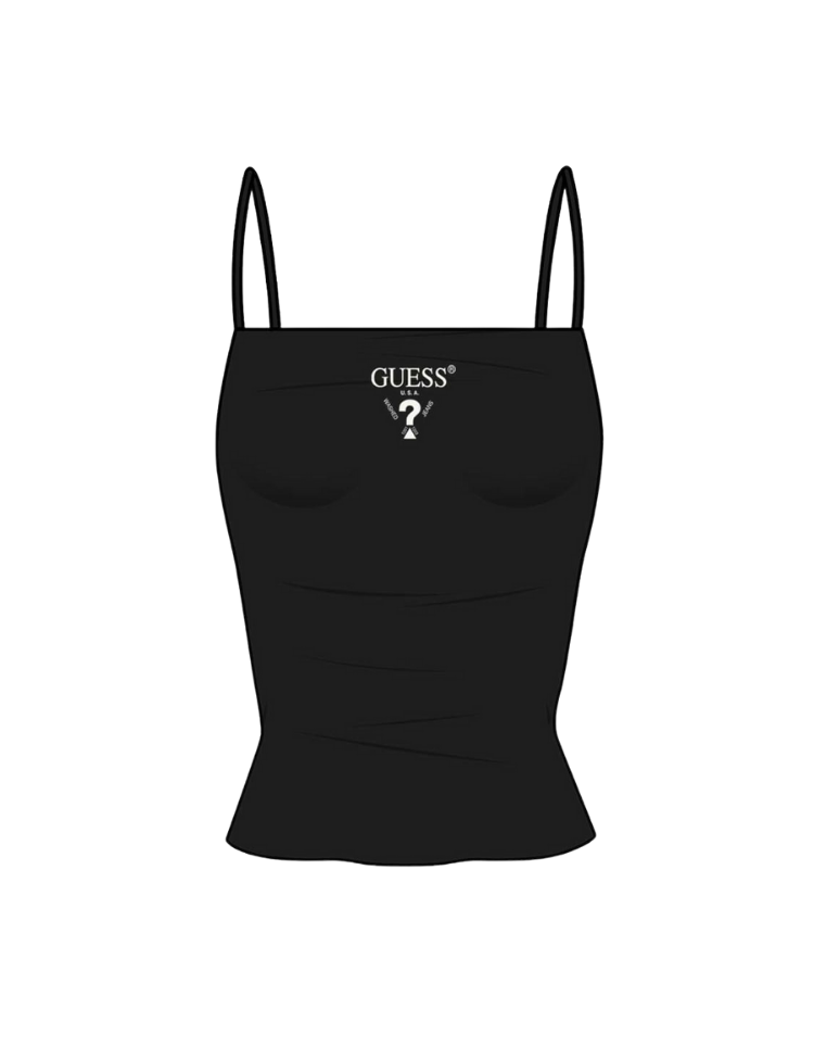 De Guess Colette Tank Top is een aangesloten top met dunne spaghetti bandjes, uitgevoerd in een zachte stretchstof. De top heeft een licht geplooide structuur aan de voorzijde en is voorzien van een geborduurd Guess-logo met vraagteken op de borst in contrasterende kleur. De stof biedt comfort en bewegingsvrijheid, ideaal voor warmere dagen of als laag onder een jasje.