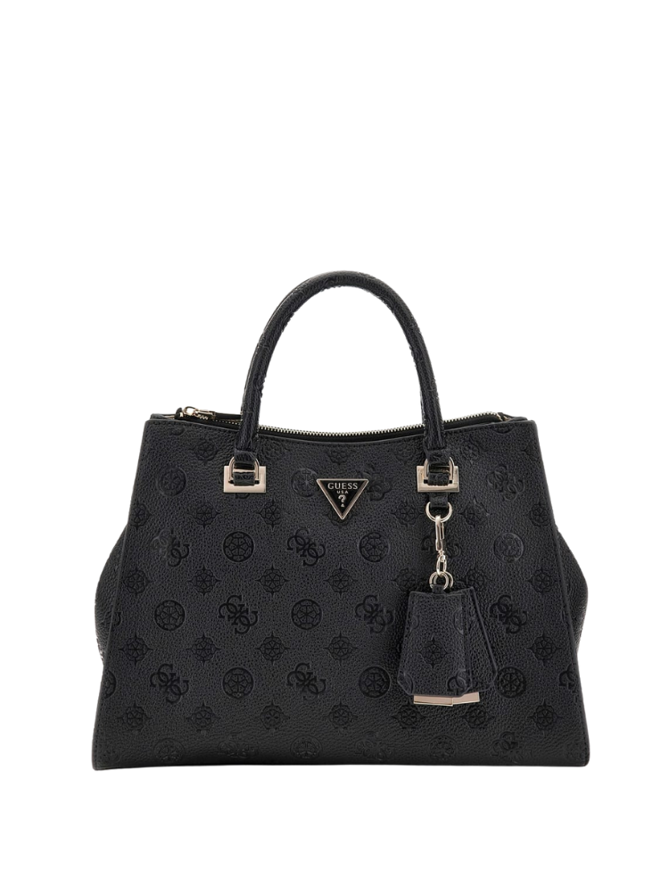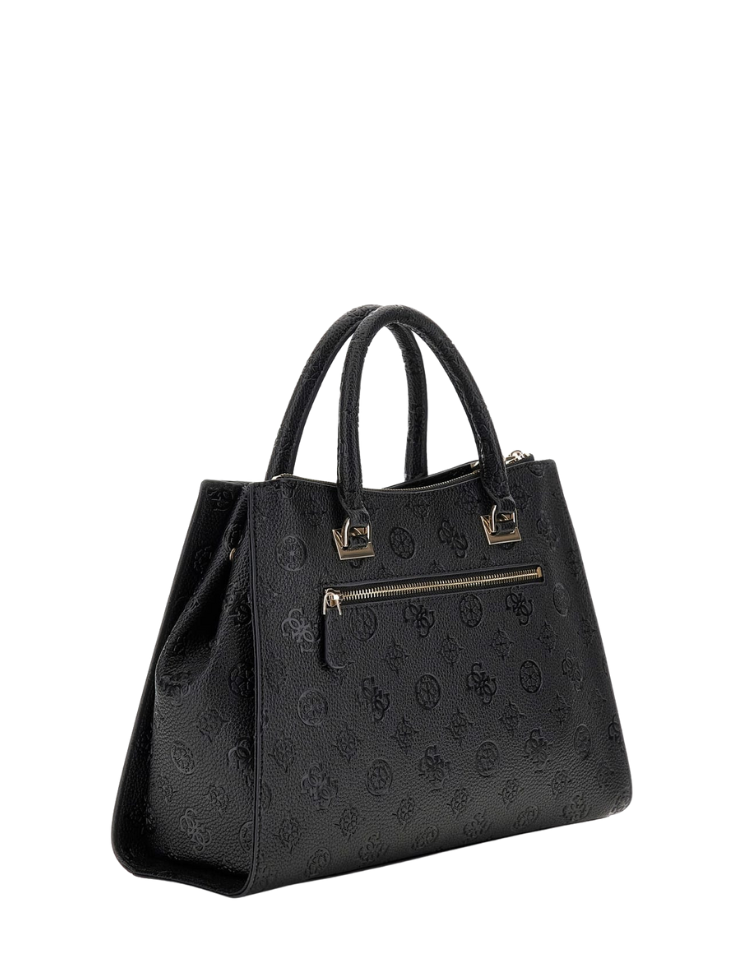 De Guess Cresidia II Society Satchel in Black Logo is een tijdloze en elegante handtas met een luxe uitstraling. Het gestructureerde design, gecombineerd met het subtiele Guess-monogram en goudkleurige details, maakt deze tas een echte klassieker. Met de ruime indeling en meerdere vakken is er plek voor al je dagelijkse essentials, terwijl de dubbele handgrepen zorgen voor comfortabel dragen. Afgewerkt met een stijlvol logo-hangertje en ritssluiting aan de achterzijde is dit de perfecte tas voor zowel werk als vrije tijd.