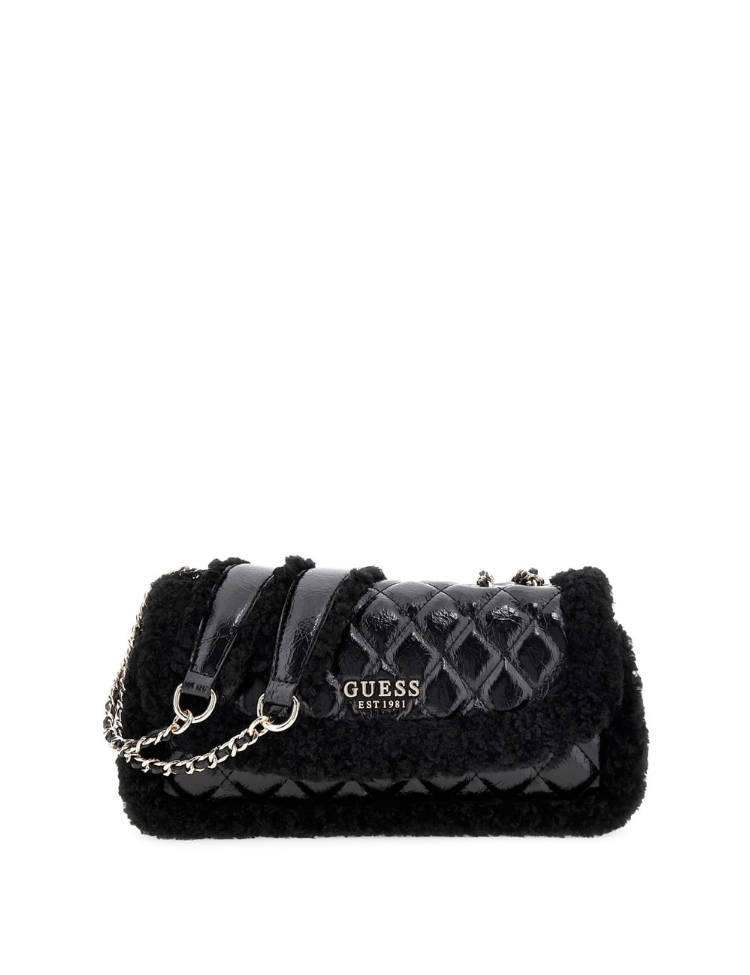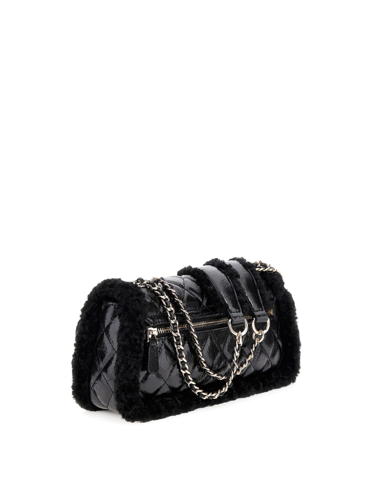 De Guess Cristi Crossbody Flap Bag - Black combineert elegantie met warmte en comfort. Deze moderne schoudertas is uitgevoerd in een luxe gewatteerde look met zachte shearling-afwerking langs de randen. Het glanzende zwarte design en de goudkleurige kettingdetails geven de tas een stijlvolle, winterse uitstraling. De tas sluit met een ritssluiting en biedt voldoende ruimte voor je essentials. Perfect voor dagelijks gebruik of een avondje uit.