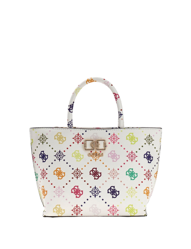 Deze mini tote van Guess heeft een compacte vorm met een witte basis. Over de hele tas zie je een all over logoprint in verschillende kleuren: roze, oranje, groen, paars en geel. De logo's zijn verbonden met kleurige stippellijnen. De tas heeft twee korte hengsels en een goudkleurige sluiting aan de voorkant met het Guess logo. Zwarte afwerking langs de randen zorgt voor contrast. Perfect formaat om je essentials in te dragen.