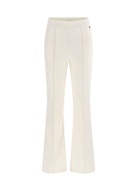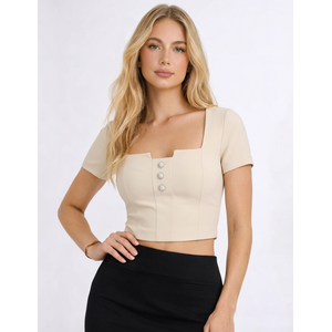 Deze cropped top in pearl white van Guess heeft een vierkante halslijn die strak afgewerkt is. De korte mouwen en het korte model eindigen net boven de taille. Aan de voorzijde zitten drie sierknopen met een subtiele steentjesdetail die de look extra flair geven. Het strakke ontwerp sluit nauw aan op het lichaam. De lichte beige tint combineert gemakkelijk met andere kleuren. Aan de achterzijde zie je een klein G logo detail op de stof.