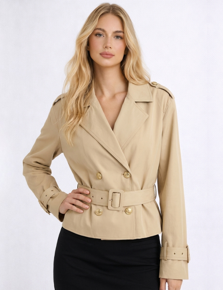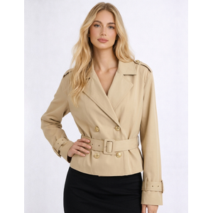 Kleur: Safari Tan Sluiting: Double-breasted met goudkleurige knopen en riemgesp Design: Brede revers, epauletten, manchetten met gesp, brede taillieriem Lengte: Cropped Artikelnummer: W6GL21W1954