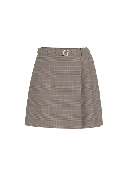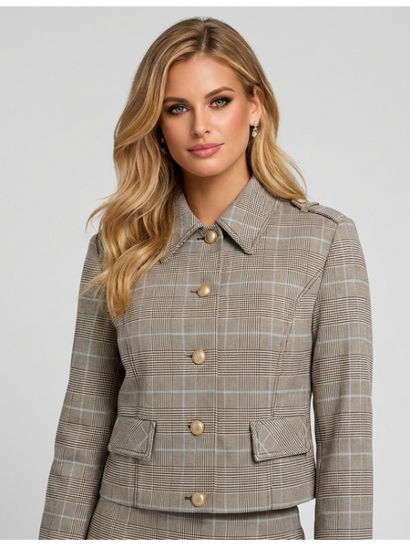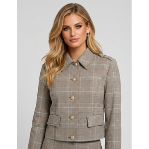 Deze korte jasje van Guess heeft een beige ruitpatroon met een stijlvolle glencheck. Het jacket valt tot net over de taille en heeft een kraag, schouderlussen en twee opgezette borstzakken met kleppen. De goudkleurige drukknopen aan de voorkant geven het een luxe afwerking. De elastische band aan de onderzijde zorgt voor een subtiele blouson pasvorm. Het jasje heeft lange mouwen met goudkleurige knopen bij de manchetten.
