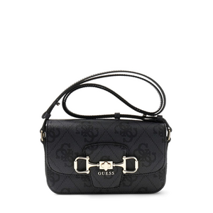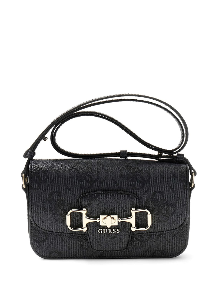 Kleur: Coal (donkergrijs/zwart) Sluiting: Draaisluiting met goudkleurig bit-detail op flap, ritssluiting op achtervak Design: Allover logo-jacquardprint, goudkleurige hardware, GUESS-logo op bit-detail Artikelnummer: HWOS9924210