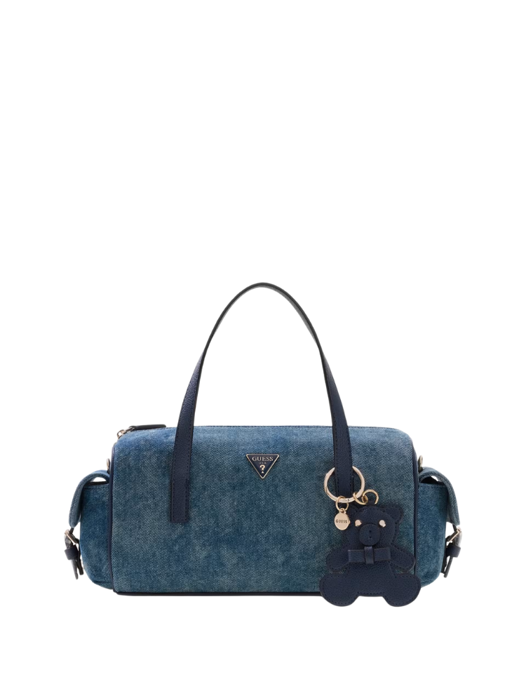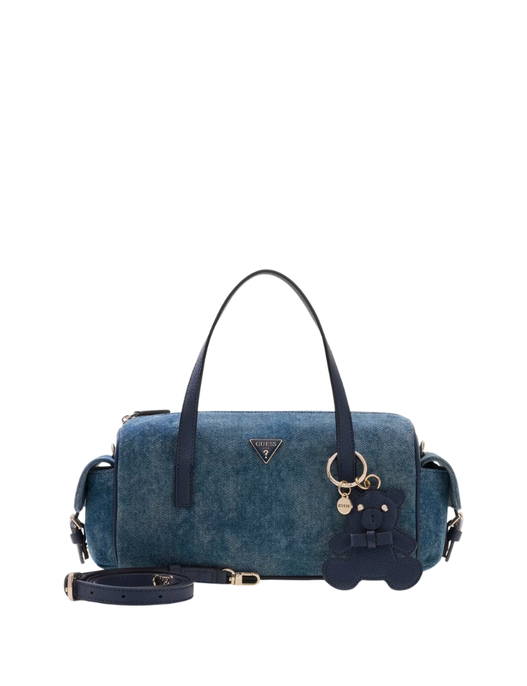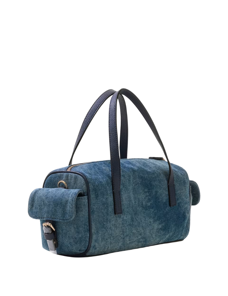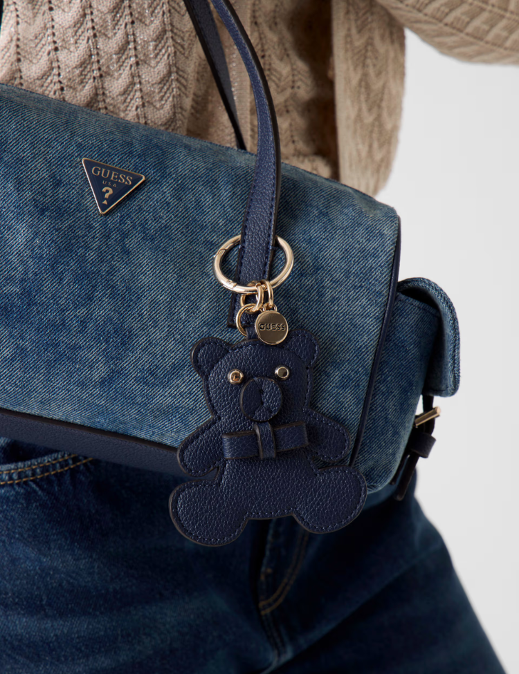 Compacte handtas in denim met een gestructureerde boxvorm. De tas heeft twee korte hengsels en een ritssluiting aan de bovenzijde. Aan de voorkant zit een opgestikte zak met klep en drukknoop. Het goudkleurige driehoekige logo versterkt de herkenbare uitstraling. Een speelse berensleutelhanger in donkerblauw kunstleer hangt aan een ring naast het hengsel. De binnenkant is gevoerd met licht stof en heeft een extra vakje met logo. De tas combineert een casual denimlook met chique afwerking.