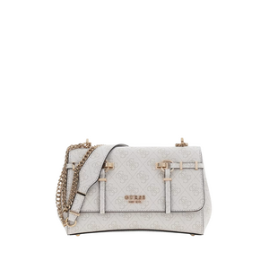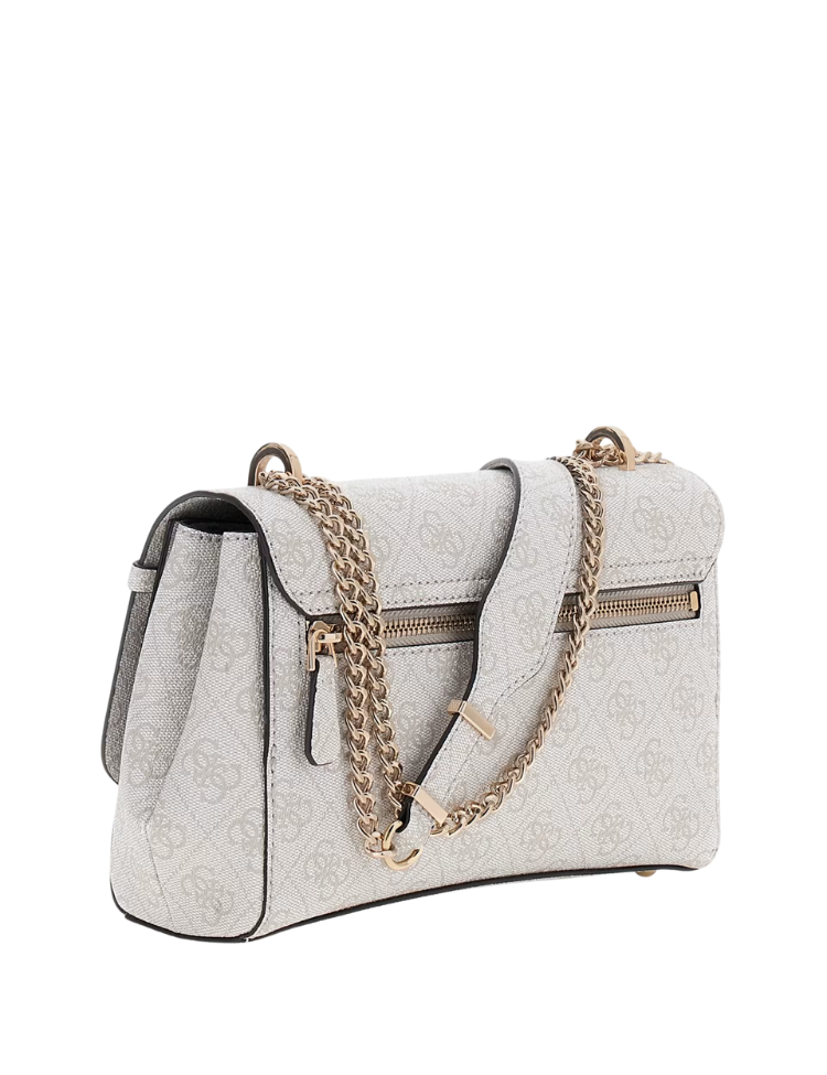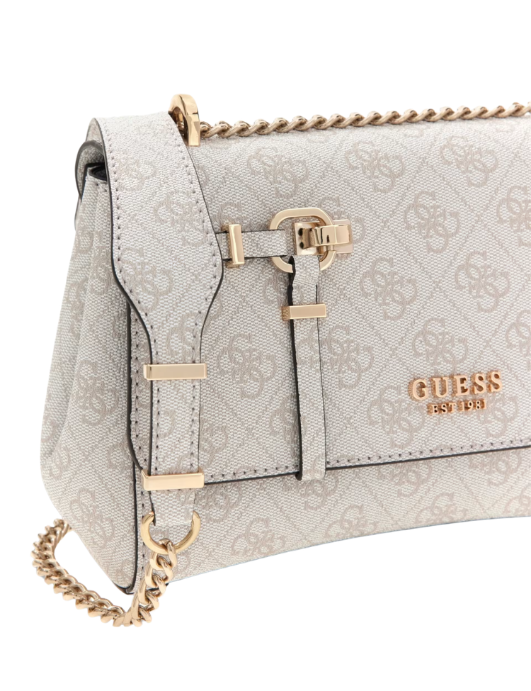 Deze crossbodytas van Guess in bone is volledig bedrukt met het herkenbare logodessin. De tas heeft een flap met magnetische sluiting en goudkleurige hardware. Aan de voorkant zit een ritsvak, aan de achterkant een plat vak. De verstelbare schouderband is uitgevoerd als goudkleurige ketting. Binnenin vind je meerdere compartimenten, waaronder ritsvakken en open vakjes. De tas heeft een voering in beige. Het merklogo is zichtbaar op de voorzijde in goudkleurige letters.