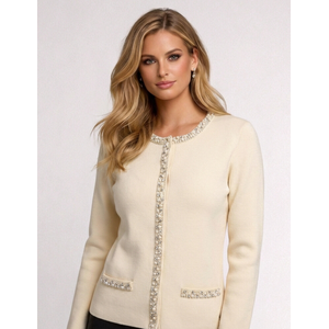 Dit cream white vest van Guess heeft een ronde hals met een afwerking van kraaltjes en parelmoer. Dezelfde detaillering loopt over de voorpanden en langs de twee paspelzakken aan de voorkant. Het vest sluit met drukknopen en heeft lange mouwen. De soepele knitstof zorgt voor een prettig draagcomfort. Een verfijnd item dat je garderobe net even anders maakt.