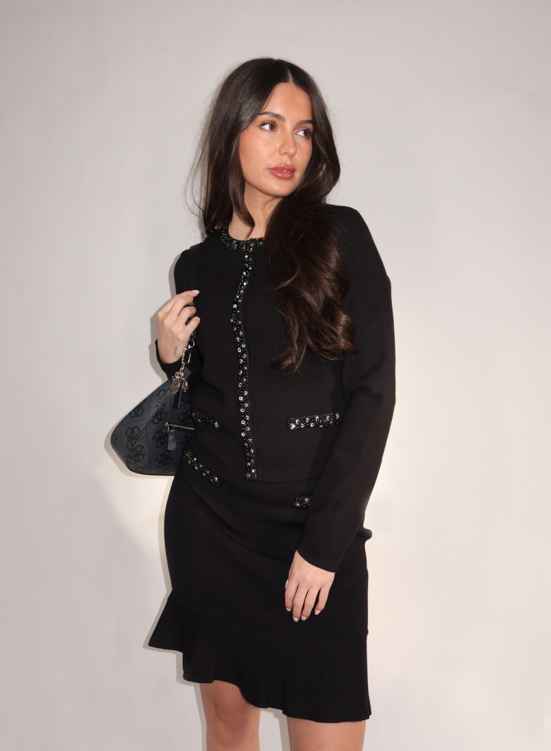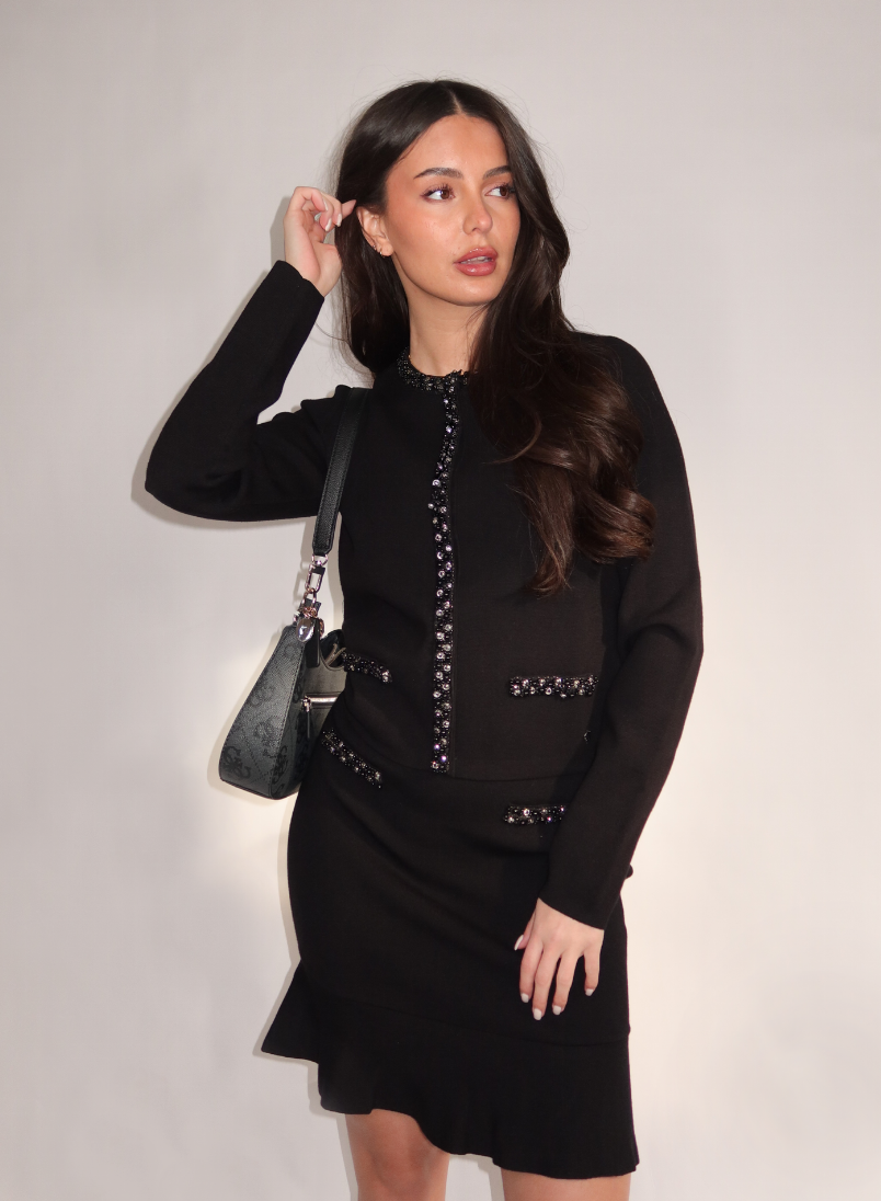 Dit zwarte gebreide vest heeft lange mouwen en een ronde halslijn. De voorkant is versierd met glinsterende steentjes langs de knoopsluiting, de zakken en de manchetten. Het vest heeft een rechte pasvorm en valt tot op de heup. De zachte knitstof biedt bewegingsvrijheid en comfort. De knoopjes zijn afgewerkt met hetzelfde steentjesdetail voor een consistent geheel.