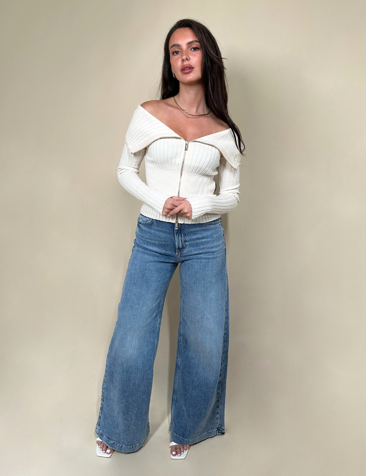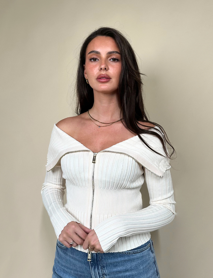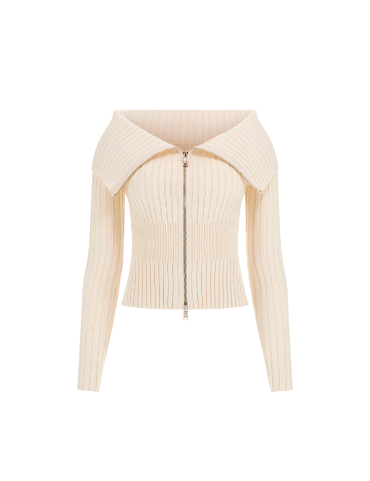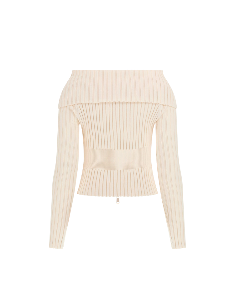 Deze geribde cardigan van GUESS is vervaardigd uit een zachte, rekbare knit in een stijlvolle cream white kleur. De sweater heeft een opvallend off-shoulder ontwerp met een brede kraag en een dubbele ritssluiting aan de voorzijde, waarmee je eenvoudig de pasvorm kunt variëren. De aansluitende snit zorgt voor een flatterend silhouet, ideaal voor een elegante casual look of als chique layering piece.