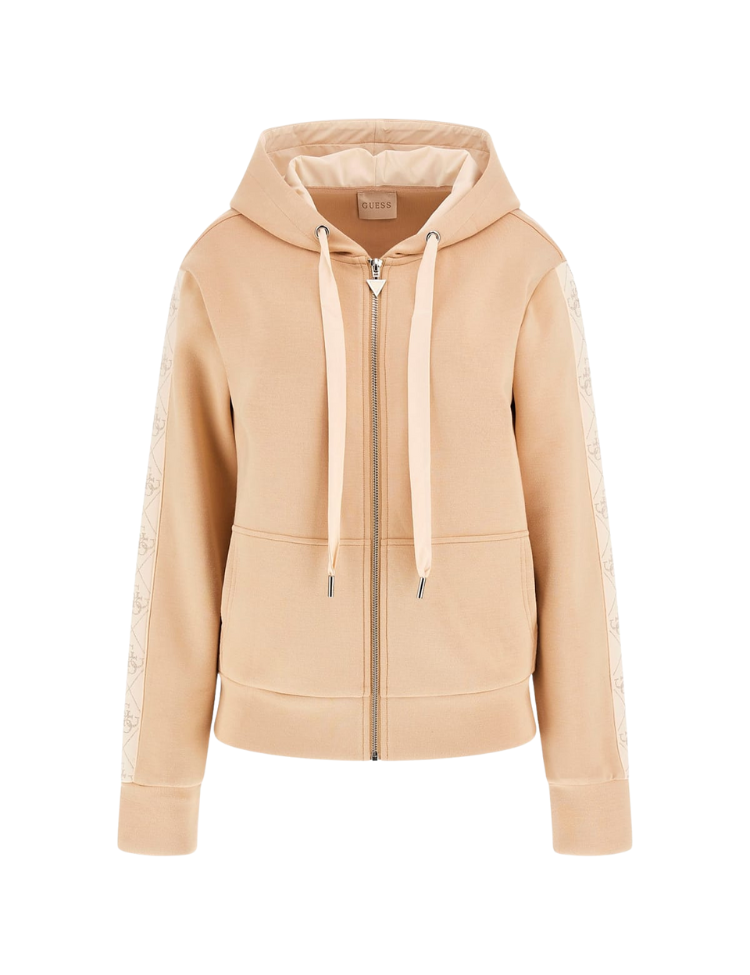 De hoodie is afgewerkt met een zilvermetalen Guess-rits, brede satijnen trekkoorden, en een ton-sur-ton logopatroon op de mouwen dat op subtiele wijze luxe uitstraalt. De gevoerde capuchon en geribde boorden zorgen voor extra draagcomfort en een nette afwerking.