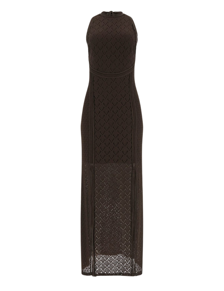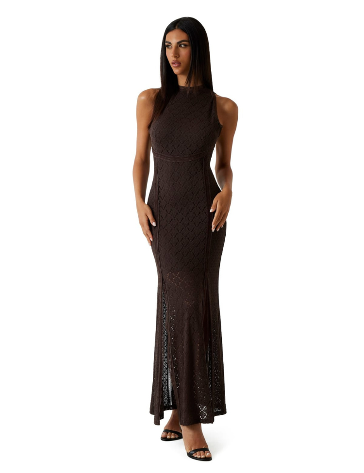 Deze mouwloze maxijurk van Guess is uitgevoerd in een opengewerkte kant met all over structuur. Het model heeft een halternek en een opvallende open rug. De jurk valt lang tot op de enkels en heeft een gehaakte textuur met transparante details. Het kledingstuk sluit aan de achterzijde met een rits en valt strak langs het lichaam. Een feestelijke jurk met een verfijnde uitstraling.
