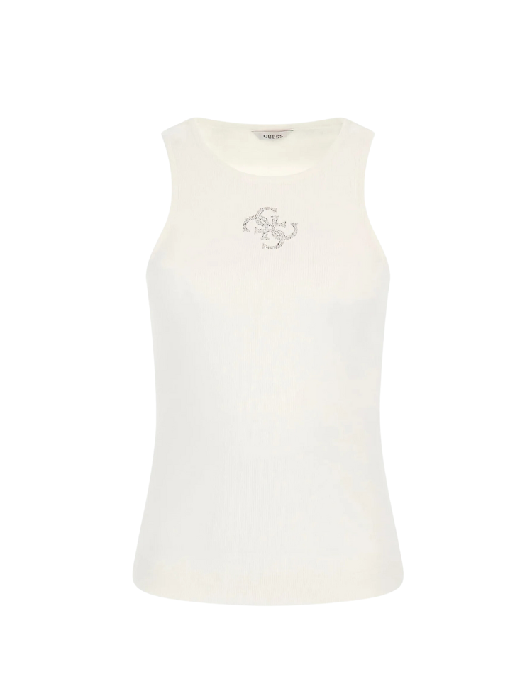 De Guess top met ronde hals heeft een slim fit pasvorm en een rechte snit, waardoor hij perfect aansluit op het lichaam. Het design is voorzien van een klein, subtiel Guess-printje op de borst en afgewerkt met siersteentjes voor een luxe uitstraling. De top heeft geen mouwen en een normale lengte, ideaal voor een casual, maar toch stijlvolle look.