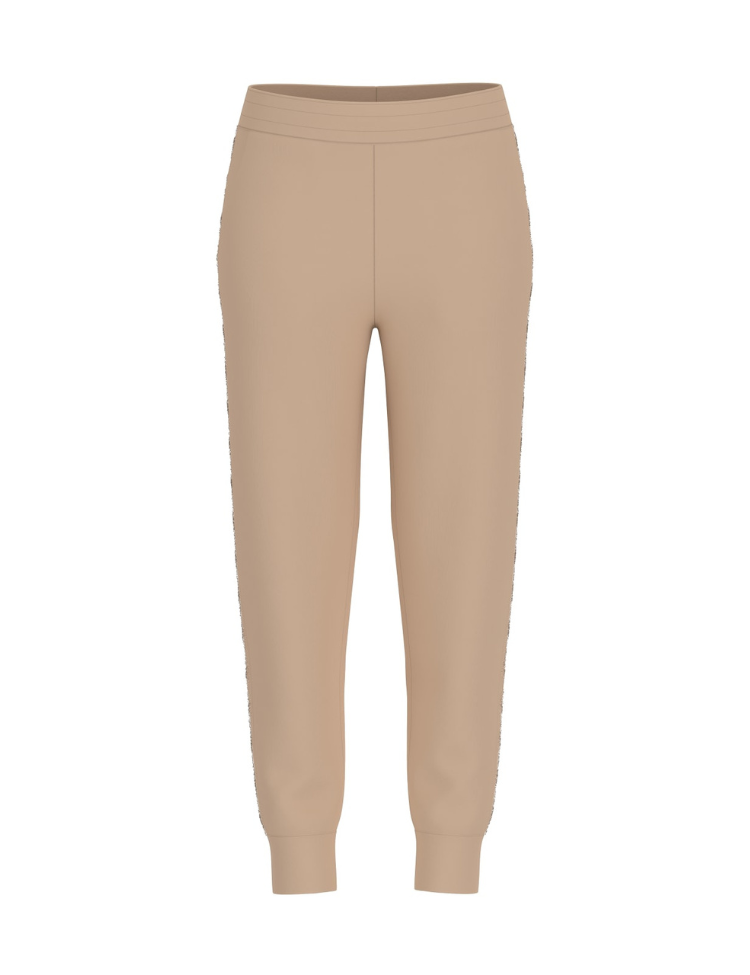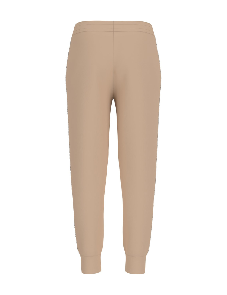 De broek heeft een tapered fit met toelopende pijpen en geribde boorden onderaan voor een sportieve afwerking. De elastische tailleband zonder koordsluiting zorgt voor een glad silhouet. De afwezigheid van zichtbare details houdt het ontwerp minimalistisch, terwijl het silhouet tijdloos blijft.