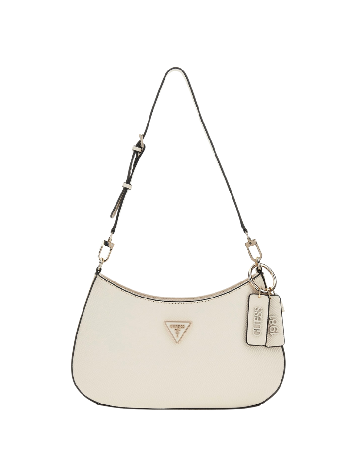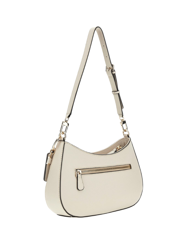 De Guess Noelle II Top Zip Shoulder Bag in Bone is de perfecte combinatie van stijl en functionaliteit. Deze schoudertas is uitgevoerd in een elegante crèmekleurige afwerking met een gestructureerd kunstleren oppervlak en subtiel gouden hardware. De tas is voorzien van een verstelbare schouderriem, een veilig hoofdvak met ritssluiting, en een handig achtervak met rits voor snelle toegang tot essentials. Op de voorkant prijkt het iconische Guess driehoeklogo in goud, terwijl de bijgevoegde logo-hangtags zorgen voor een luxe accent. Compact maar ruim genoeg voor je dagelijkse benodigdheden – een must-have voor elke modebewuste vrouw.
