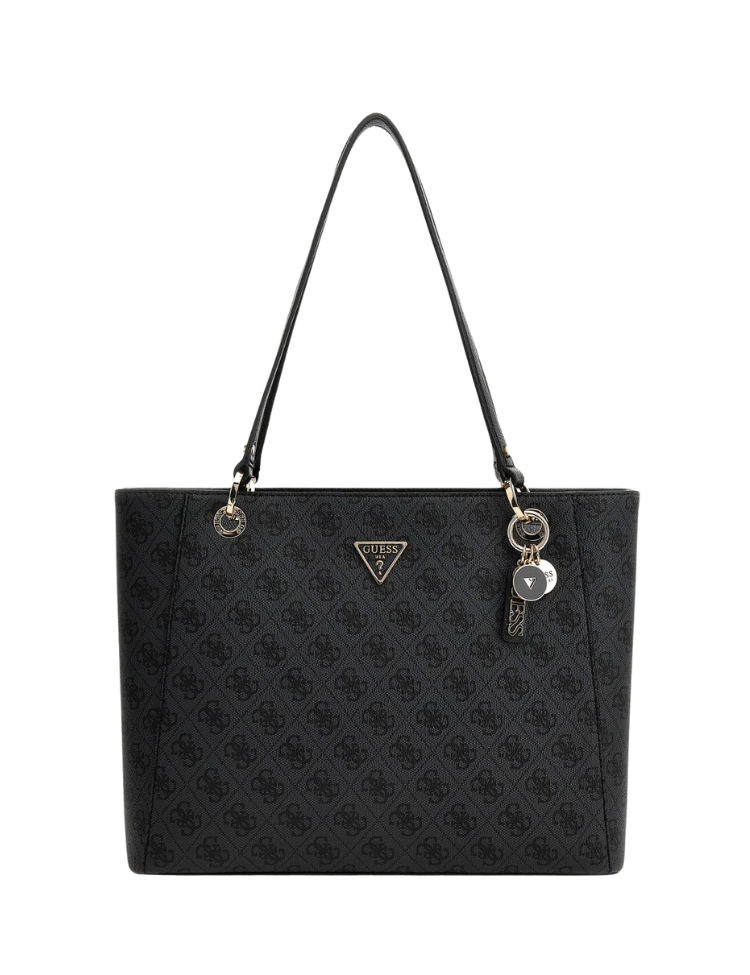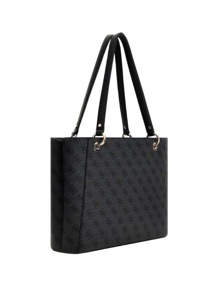 De Guess Noelle II Tote Bag in Coal Logo is een ruime en stijlvolle schoudertas die perfect is voor dagelijks gebruik. Deze tote is uitgevoerd in het iconische Guess-monogram en afgewerkt met goudkleurige details en een elegante hanger met logo. Dankzij de royale binnenruimte neem je al je essentials moeiteloos mee, of het nu gaat om werk, studie of een dagje shoppen. De lange hengsels zorgen voor optimaal draagcomfort, terwijl de stevige constructie de tas een luxe uitstraling geeft.