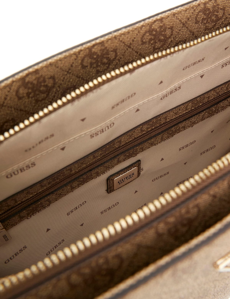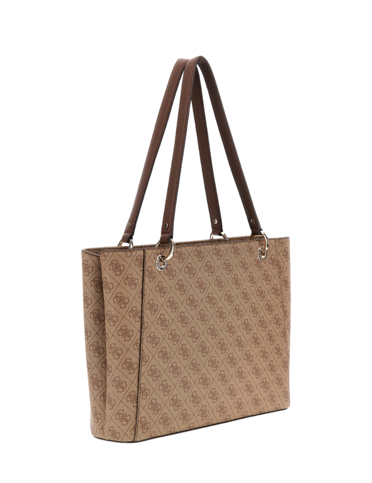 De Guess Noelle II Tote Bag in Latte Brown is een ruime en stijlvolle schoudertas die perfect is voor dagelijks gebruik. Deze tote is uitgevoerd in het iconische Guess-monogram en afgewerkt met goudkleurige details en een elegante hanger met logo. Dankzij de royale binnenruimte neem je al je essentials moeiteloos mee, of het nu gaat om werk, studie of een dagje shoppen. De lange hengsels zorgen voor optimaal draagcomfort, terwijl de stevige constructie de tas een luxe uitstraling geeft.