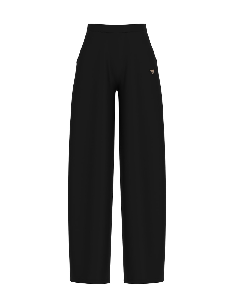 De hoge taille en minimalistische afwerking zonder opvallende naden of zakken aan de voorzijde versterken de cleane uitstraling. Aan de zijkant is de broek subtiel voorzien van een mat Guess-logoplaatje, een discreet maar stijlvol detail.