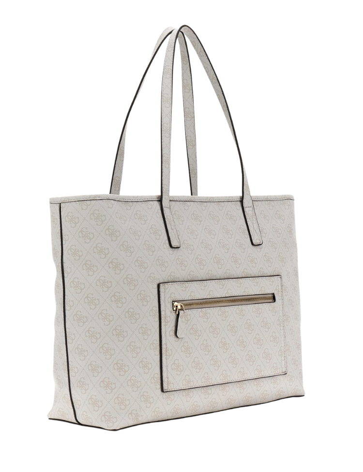 Deze ruime shopper is uitgevoerd in beige met een allover logoprint. De tas heeft lange schouderhengsels en een open bovenzijde. Aan de voorkant zit een goudkleurig driehoekig logo en een klein tasje met merkdetail. Aan de achterzijde bevindt zich een extra ritsvakje met goudkleurige rits. De tas heeft een stoffen voering met het woord Guess in een herhalend patroon, voorzien van een ritsvak aan de binnenkant. Het vak aan de voorzijde kan je apart dragen als kleine tas.