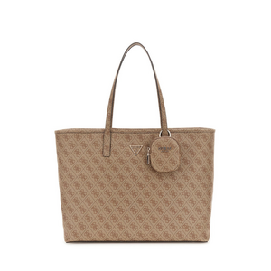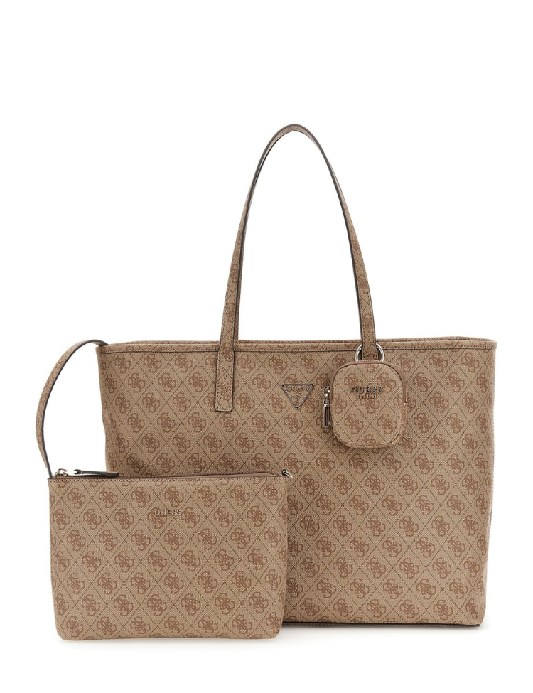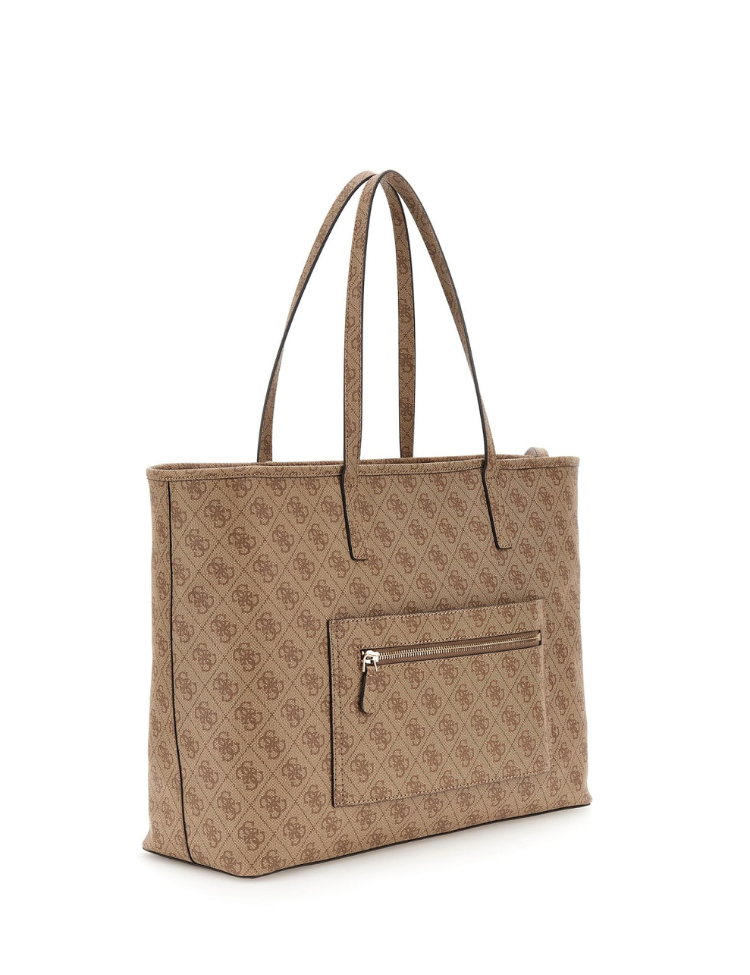 Grote shopper in een warme latte tint, volledig bedekt met het kenmerkende Guess 4G-logoprint. De tas heeft twee smalle schouderbanden en een goudkleurig driehoekig Guess-logo op de voorzijde. Aan de zijkant zit een ritszak met goudkleurige rits. De set is compleet met een bijpassende ritspouche en een klein rond coinpasje met rits, beide in hetzelfde 4G-print.