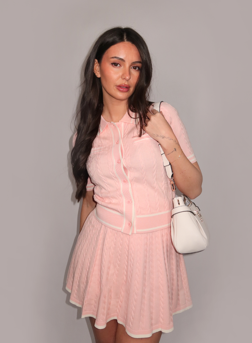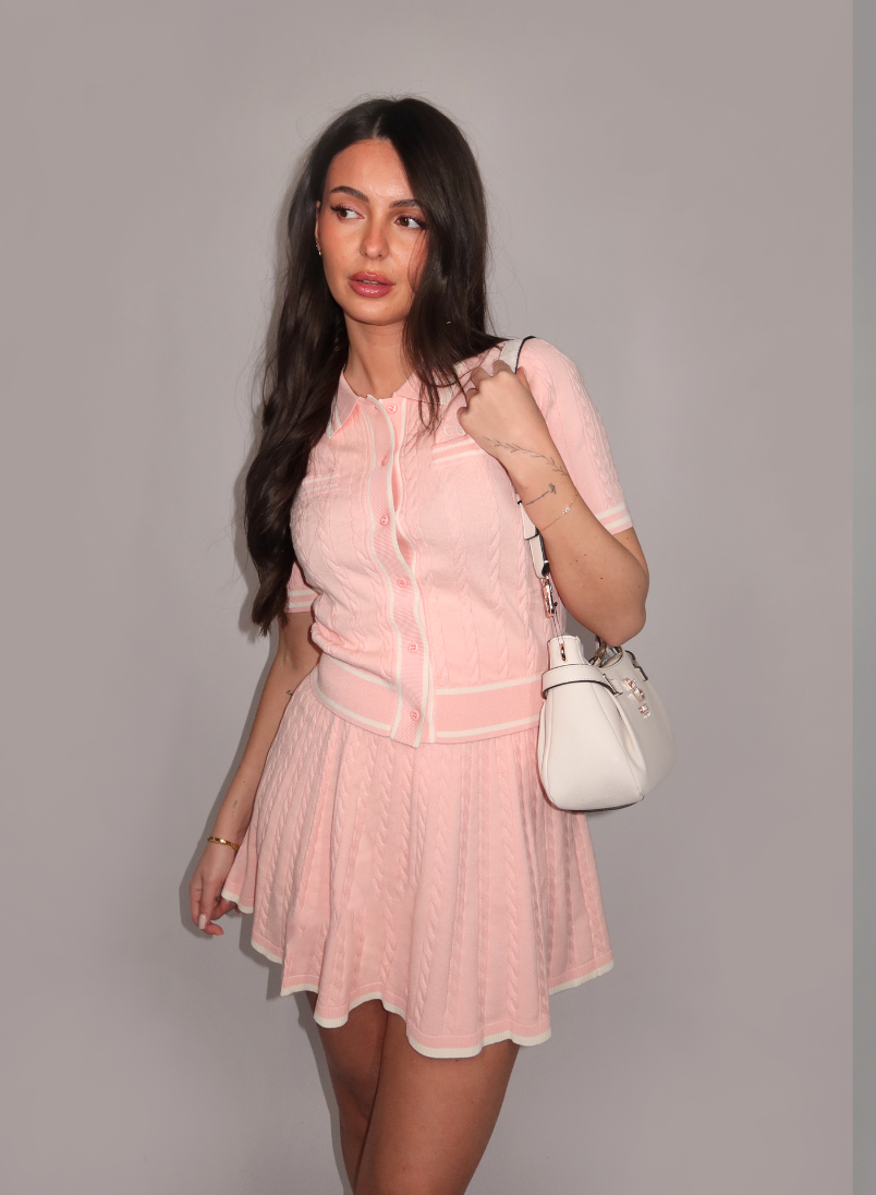 Deze roze rok van Guess combineert een zachte knitstructuur met een speels silhouet. De Shari rok is volledig gebreid met een kabelpatroon dat over de hele rok loopt. De brede, elastische tailleband zorgt voor een comfortabele pasvorm. Het uitlopende model geeft de rok een vrouwelijke uitstraling. De fijngebreide stof is soepel en houdt zijn vorm goed. De korte lengte valt net boven de knie.
