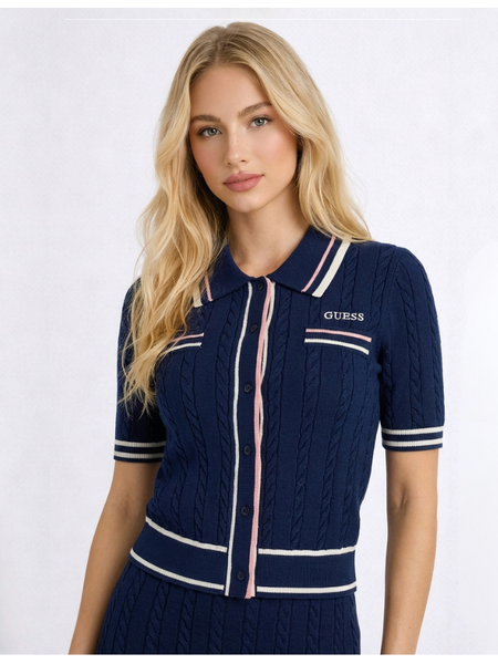 Deze gebreide rok van Guess valt op door het kabelpatroon over de volledige lengte. Het tricot materiaal geeft stretch en draagcomfort. De rok heeft een brede elastische tailleband en een uitlopende A-lijn pasvorm. De korte lengte eindigt boven de knie. De diepblauwe kleur heeft een rijke uitstraling.