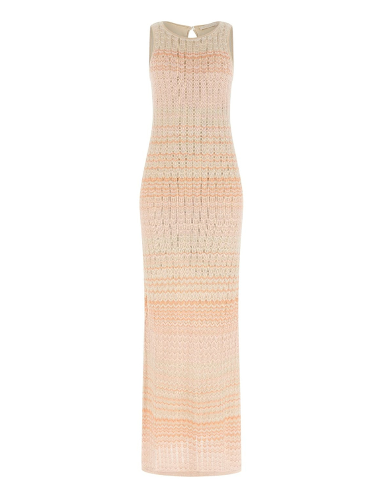 Deze mouwloze maxijurk van Guess is uitgevoerd in een gebreide, geribbelde kwaliteit met zachte structuur. De lange jurk heeft een ronde halslijn met opengewerkt detail aan de achterzijde en een knoop met druppelvormige uitsparing. Het knitwear design toont een horizontaal gestreept patroon in peach, beige en vanilletinten die over de lengte afwisselen. De jurk heeft een smalle pasvorm die het lichaam volgt en valt tot op de enkels. Het gebreide materiaal zorgt voor stretch en comfort.