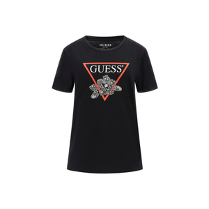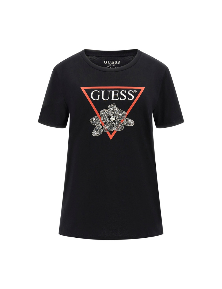 Voeg een vleugje glamour toe aan je dagelijkse outfit met de Guess SS Flower Bling Easy Tee in Jet Black. Dit T-shirt heeft een klassiek silhouet met een ronde hals en korte mouwen, en wordt gesierd door het iconische Guess-logo in een driehoekvorm, verrijkt met schitterende bloemen van strass steentjes. Het zachte katoen met stretch zorgt voor een comfortabele pasvorm en maakt dit shirt ideaal voor elke gelegenheid, van een casual dagje uit tot een avondje met vrienden. Combineer het met jeans, een rokje of een stoere leren broek voor een veelzijdige en stijlvolle look.
