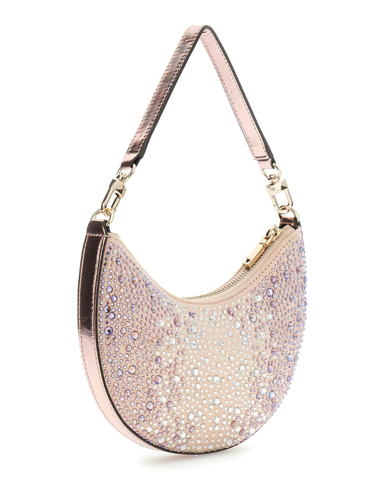 Kleur: Light Rose Sluiting: Ritssluiting aan de bovenzijde Design: Halfronde vorm met allover strass steentjes in zilver en lila, metallic schouderhengsel met goudkleurige hardware en drukknopsluiting Artikelnummer: HWEG9931720