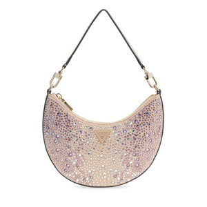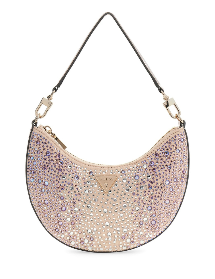 Kleine schoudertas van Guess in een halfronde vorm, volledig bezet met strass steentjes in verschillende maten. De steentjes variëren van helder zilver tot lila paars en geven de tas een glanzend, gelaagd effect. Het metallic roze schouderhengsel is voorzien van goudkleurige hardware en een drukknopsluiting. De ritssluiting loopt langs de bovenkant van de tas.
