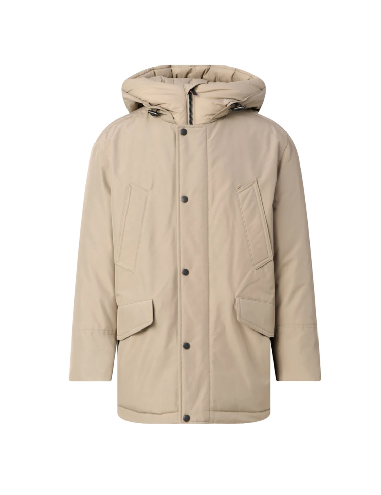 De jas is uitgevoerd in hoogwaardig technisch materiaal dat zowel wind- als waterafstotend is, met een zachte structuur en een matte afwerking voor een luxe uitstraling. De lichte wattering zorgt voor optimale warmte-isolatie, terwijl de afneembare capuchon met verstelbare trekkoorden extra bescherming biedt tijdens gure dagen.