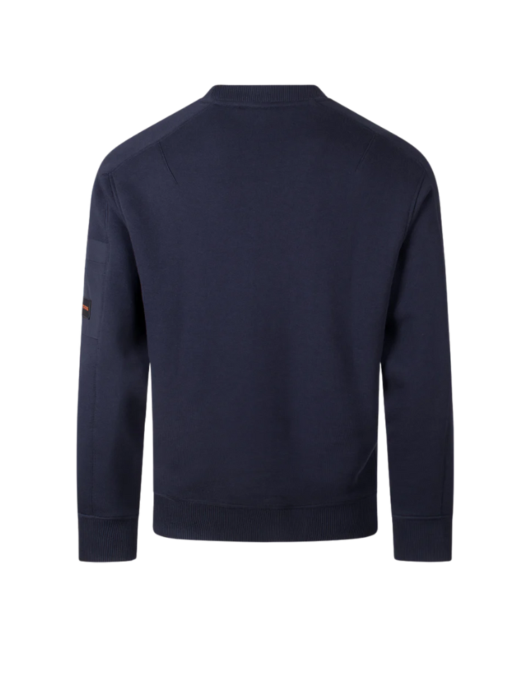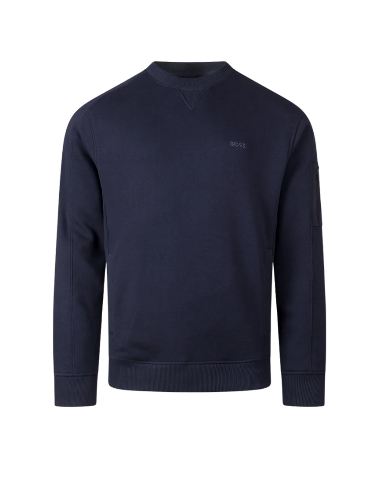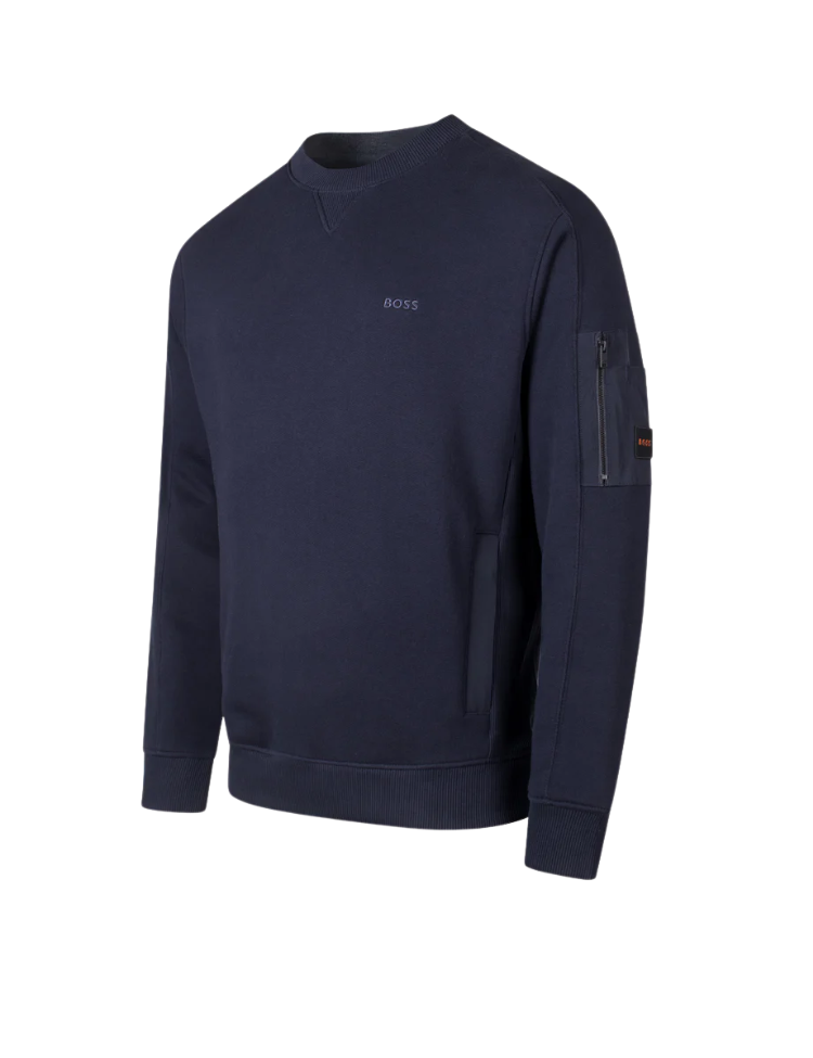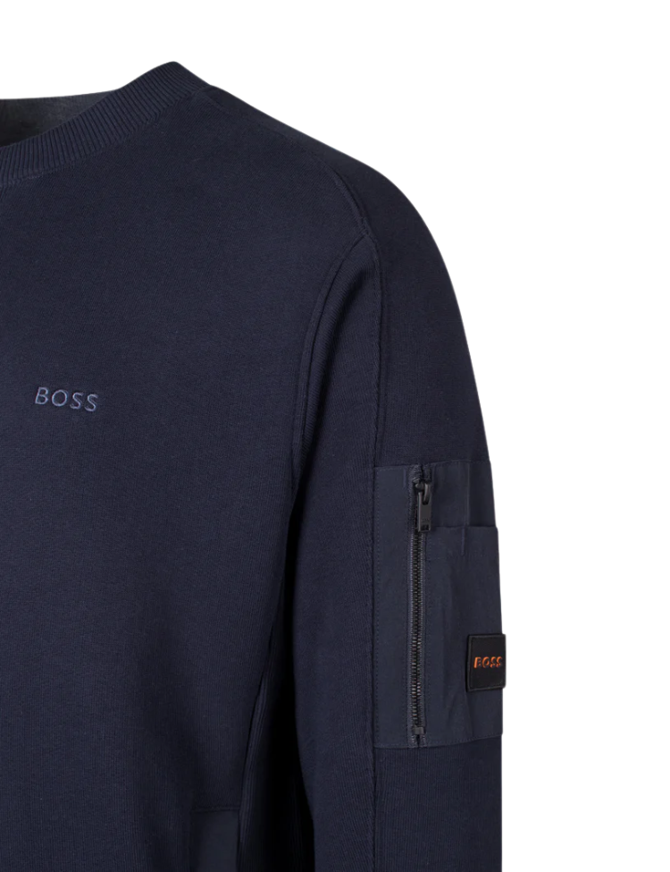 De BOSS We Mixed sweater in donkerblauw combineert casual comfort met subtiele, luxe details. Gemaakt van hoogwaardig katoen met een zachte touch, biedt deze trui een moderne uitstraling dankzij de regular fit en minimalistische branding op de borst. Op de mouw vind je een praktische zak met ritssluiting en een contrasterend logo-patch, wat een sportief en functioneel accent toevoegt. De ronde hals, geribbelde boorden en nette afwerking maken deze sweater ideaal voor zowel casual outfits als een smart-casual look.