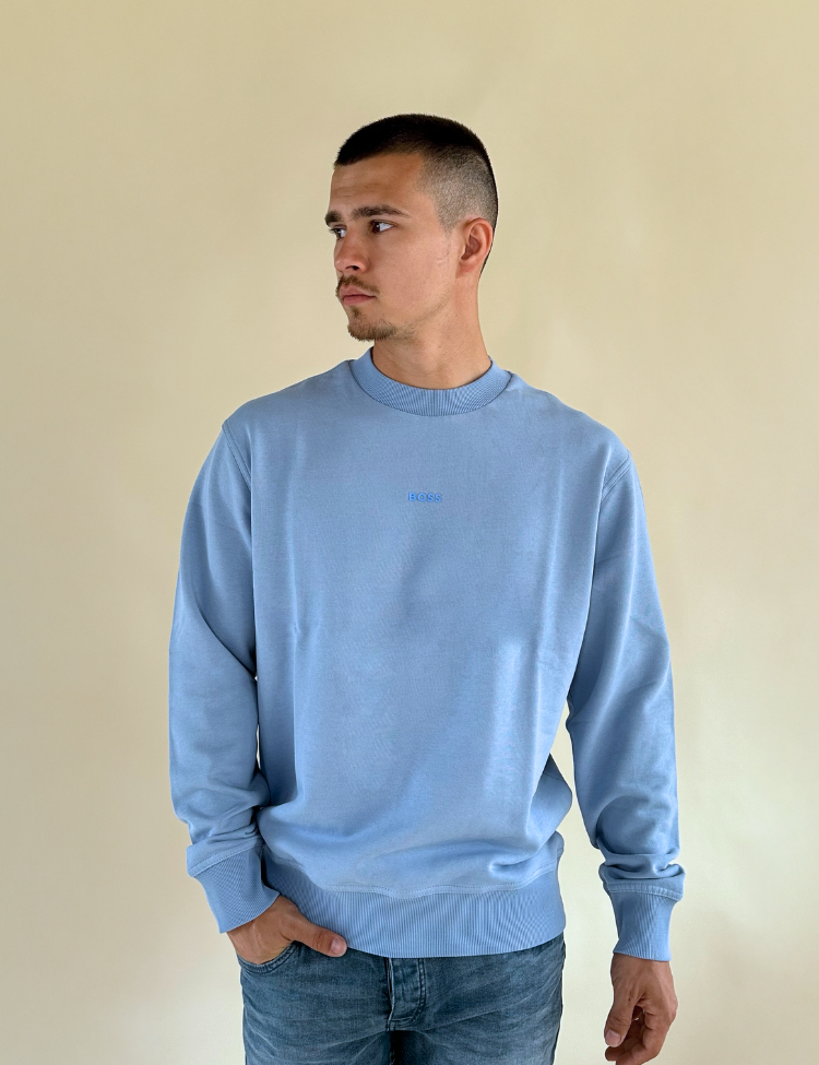 Voeg een stoere, comfortabele klassieker toe aan je garderobe met de BOSS WeSmallcrew sweater in een blauwe kleur. Deze crewneck sweater combineert moeiteloos minimalisme met een casual uitstraling. Gemaakt van een zachte sweatstof met een vleugje stretch, biedt dit item ultiem draagcomfort voor elke dag.