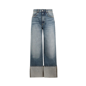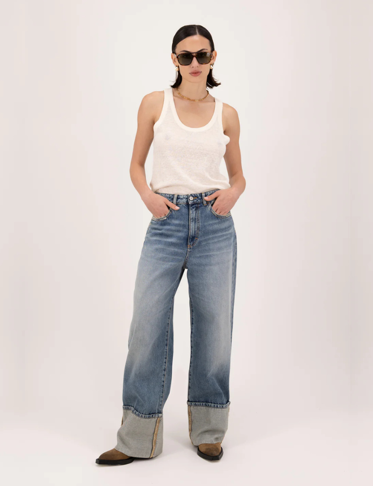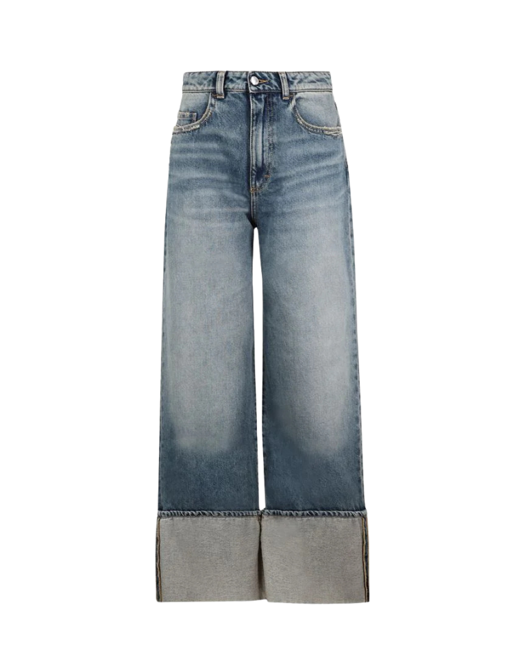 Deze denim broek heeft een hoge taille en wijde, rechte pijpen met een opvallend detail: een brede omgeslagen zoom in lichtgrijs. De smoke blue wassing geeft een subtiele, uitgeleefd effect. De jeans heeft klassieke steekzakken aan de voorkant, achterzakken en een knoopsluiting met rits. Het denim voelt stevig aan en houdt goed zijn vorm. De brede omslag aan de onderkant maakt dit item bijzonder en geeft je look direct een eigentijdse twist.