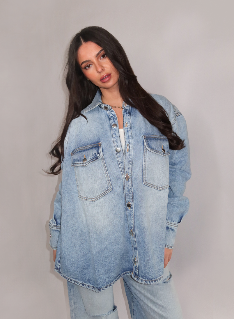 De blouse draag je open over een witte top met een lichte jeans voor een toonoptoonstyling. Ook leuk over een jurk of getailleerde broek. ICON Denim combineert denim met een eigentijdse twist.