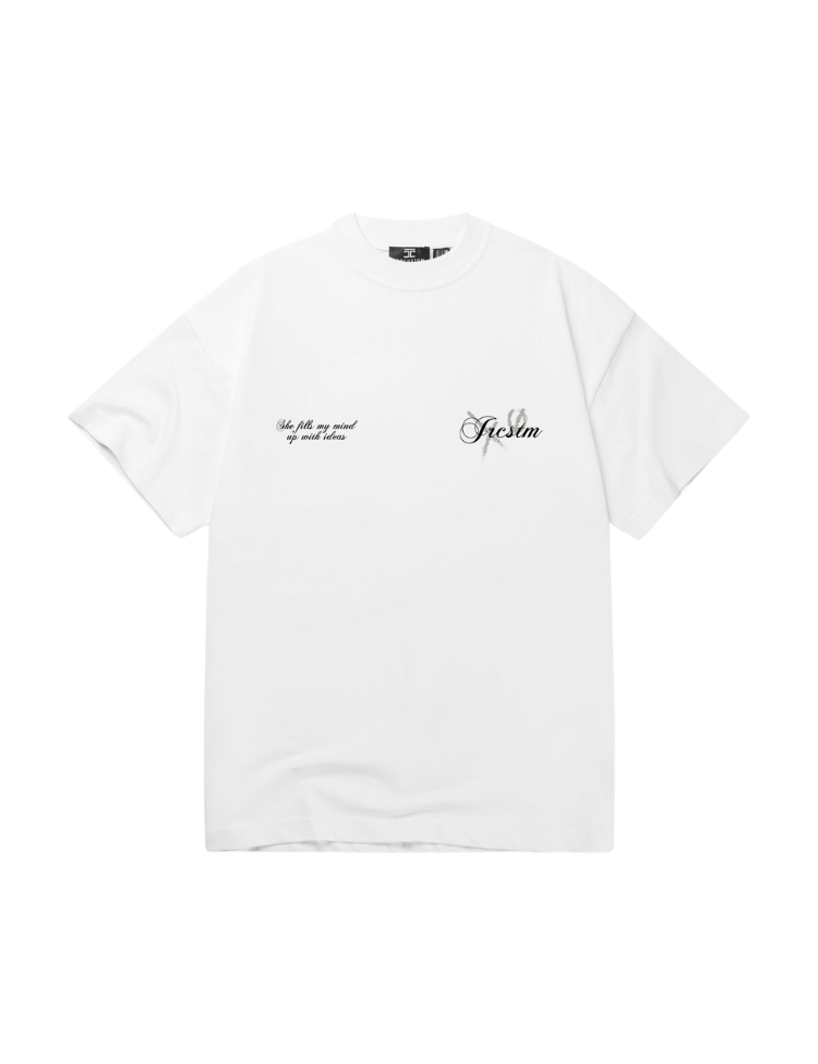 Laat jouw streetwearstijl spreken met de Angel Loose Fit T-Shirt van JorCustom in de cleane kleur White/Grey. Deze relaxed fit tee combineert kunst en mode moeiteloos dankzij de indrukwekkende backprint van een klassiek engelenmotief en de quote “She fills my mind up with ideas”. Een subtiele knipoog naar creativiteit en emotie.